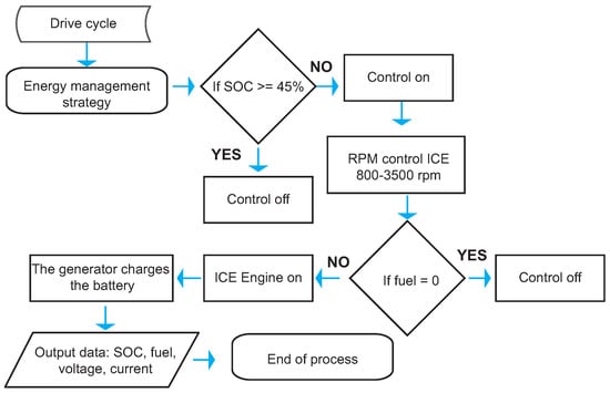 The electric vehicle operates when the driver presses the accelerator pedal, which triggers a torque setpoint request for the induction machine’s power stage. This stage consists of a three-phase voltage inverter that requires a constant voltage and variable current from the battery management system (BMS). From an energy perspective, the electric motor converts electrical energy into mechanical energy. This rotational energy is then transferred through the gearbox to the differential, eventually reaching the rear wheels and resulting in the vehicle’s longitudinal motion. The auxiliary power unit (APU) extends the vehicle’s range by charging the batteries when activated. The developed control functions regulate the speed at which the internal combustion engine (ICE) operates.