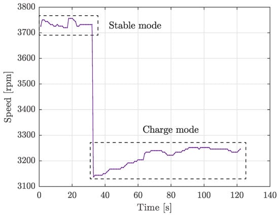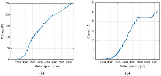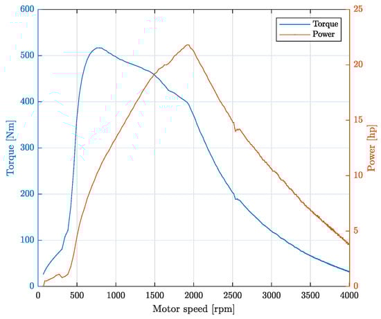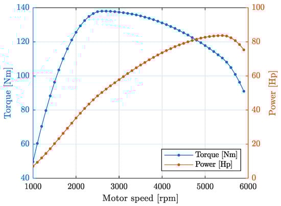 The powertrain for the experimental test vehicle was chosen with the goal of creating an affordable utility transport vehicle, which required the use of a small motor. The powertrain features a central induction electric motor with a nominal output of 15 hp. This motor is a three-phase, four-pole unit that is mechanically connected to a five-speed gearbox. The gearbox is then connected to a differential on the rear axle, which transfers power to the wheels. The electric motor operates within a voltage range of 96 to 220 V and is powered by a 32 kW battery pack with a nominal voltage of 105 V, ensuring it stays within the motor’s operating range and provides the necessary energy for efficient performance. The complete vehicle specifications are summarized in Table 2. These parameters were determined through dedicated characterization experiments using CIMA’s laboratory equipment, including a chassis dynamometer.