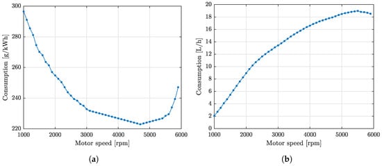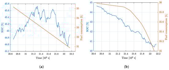 The ECMS approach is based on the principle that a cost is assigned to electrical energy, making the stored electrical energy equivalent to consuming (or saving) a certain amount of fuel. Although this cost is not directly known since it depends on future vehicle behavior—it has been shown that it can be broadly related to driving conditions. When implementing ECMS, the use of stored electrical energy is accounted for in terms of chemical fuel usage (g/s), allowing for the definition of an equivalent fuel consumption that considers the cost of electricity [62,63]. The key concept of ECMS is that, in sustain mode, equivalent fuel consumption can be linked to the use of electrical energy.