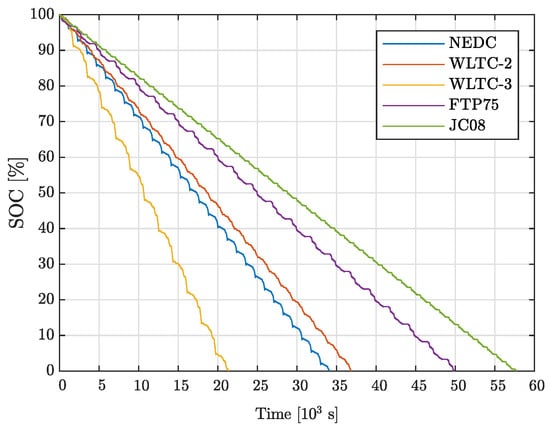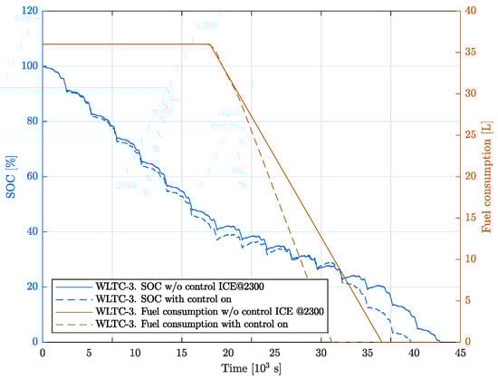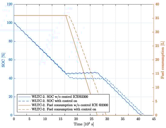 In charge-sustaining mode, the net energy drawn from the battery should be zero over the course of a given driving mission, meaning that the SOC at the end of the driving cycle should match the SOC at the start. In cases where battery depletion is desired, the target SOC value may be lower than the initial one. Equation (2) establishes the global state constraints for the control problem, primarily to ensure that different solutions can be compared fairly by having them start and end with the same battery energy level. In real-world vehicle applications, it is typically sufficient to maintain the SOC within a certain range, as a slight difference between the desired and actual SOC at the end of a cycle is acceptable and does not impact the vehicle’s functionality.