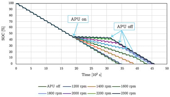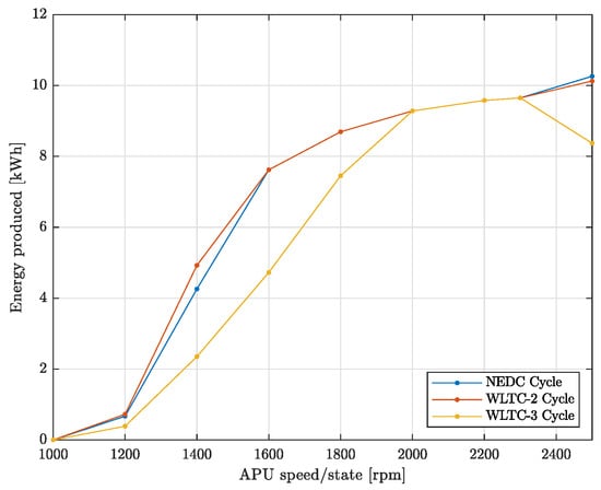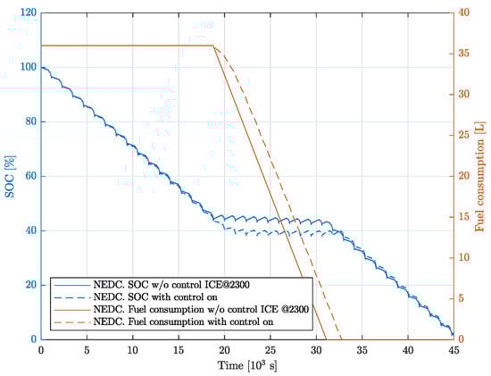For using the ECMS, it is important to highlight that the revolutions at which the internal combustion engine rotates directly influence the energy produced and fuel consumption. Therefore, the objective is mainly to reduce fuel consumption and generate the greatest amount of energy, which in this case would become the equivalent energy that can be obtained with adequate control of the engine and the generator or alternator. To meet this objective, and under the previous simulations, it is possible to observe that the revolutions at which the greatest amount of energy is obtained with the least consumption are between 1000 and 3500 rpm. For this, the state of charge will be stabilized in a percentage initially established by the controller, and depending on the driving cycle, the control will vary the revolutions of the engine and the generator/alternator depending on the SOC. To summarize, the SOC will feed the control, and the control will send the motor the revolutions at which it must work depending on the consumption and discharge of the batteries. To stabilize the SOC and control the engine with the necessary revolutions at which the generator/alternator will deliver the greatest energy depending on the requirement of the driving cycle, a PID control will be used; in this case, I specify only the proportional (P) and it will contain a saturation between 1000 and 3500 rpm. To verify the thesis that adequate control can improve consumption and generate more energy, the strategy mentioned above is applied, and simulations are carried out in the NEDC management cycle, WLTC-2 and WLTC-3. The results are shown below in the next section, and they are compared to the largest generation of energy without control and the application of the strategy. The flowchart with which the control works is fed directly with the SOC of the battery and tries to keep the defined SOC as stable as possible by varying the engine revolutions, and this generated energy feeds the batteries; the amount of fuel is sensed second by second, and when it is finished, the engine stops running and the APU shuts down. See Figure 6.