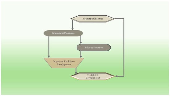 Coercive, mimetic, and normative isomorphism impact organizations, resulting in adopting practices that conform to institutional expectations and international standards [,]. Organizations may, for instance, adopt particular environmental practices or remanufacturing procedures to acquire credibility and acceptance in the industry and society. Furthermore, the reskilling of the EV LIB remanufacturing sector reflects the trends observed in the UK construction industry. Changing institutional norms and the imperative to bridge skill gaps frequently influence skill development initiatives []; organizations modify their workforce to align with evolving industry standards and sustainability responsibilities [,]. Figure 1 presents a conceptual framework illustrating the institutional influences on EV LIB remanufacturing.