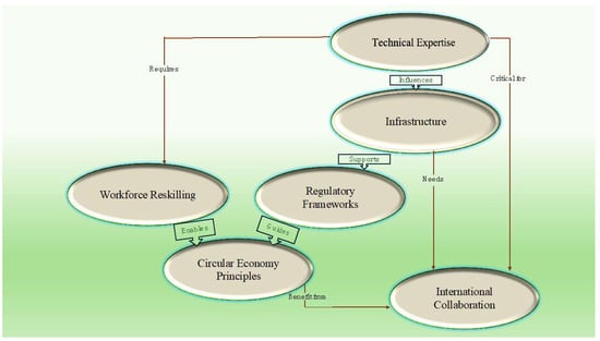 The interviewee highlights the pivotal role of training programs: “In the context of EV LIB remanufacturing, innovative training programs are essential for embedding circular economy concepts into the workforce. Envision a curriculum that melds cradle-to-cradle thinking with standard skill-building modules, enabling technicians to understand the environmental impact of their actions.” Collaboration with sustainability experts can further enrich the learning experience. “Imagine a training session where environmental scientists work alongside technicians to brainstorm circular solutions. This collaborative learning enhances technical proficiency and nurtures a mindset where every action contributes to a circular and regenerative approach in EV LIB remanufacturing.” Scholars such as [,] emphasize the need for skill development in green industries, particularly in remanufacturing. Key emerging sub-themes in this section are the significance of public–private partnerships in creating training programs, the use of technology to replicate real-world sustainability challenges, and the necessity of a multidisciplinary approach that integrates technical expertise with environmental consciousness.