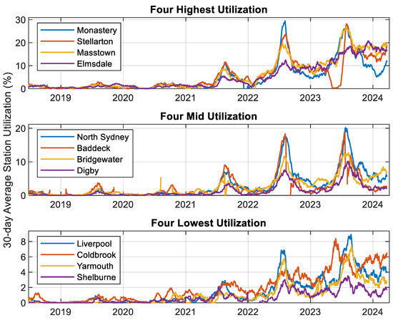 Figure 2 shows a variety of important points about the charger utilization dataset. First, it shows that utilization has grown significantly through the duration of data gathering. Note that travel in 2020, and to an extent in 2021, was depressed by COVID-related travel restrictions. Second, it shows a very clear seasonal travel spike in the late summer, when schools are not in session and the weather is mostly likely to be pleasant. This implies that tourism, be it interprovincial or intraprovincial, is a very important consideration in the demand for DCFCs. Third, it shows that this seasonal spike is not consistent in relative magnitude across the various locations (tourist destinations are not evenly distributed across the province). Fourth, it shows that, irrespective of the seasonality, there is a significant difference between the UF of chargers at different sites around the province, amounting to a factor of roughly 10. Finally, Figure 2 shows various kinds of errors in the data record, such as a prolonged service interruption in Stellarton (red, top plot) during the spring of 2023 and anomalous spikes in utilization, such as in Bridgewater (yellow, middle plot) during the summer of 2020.