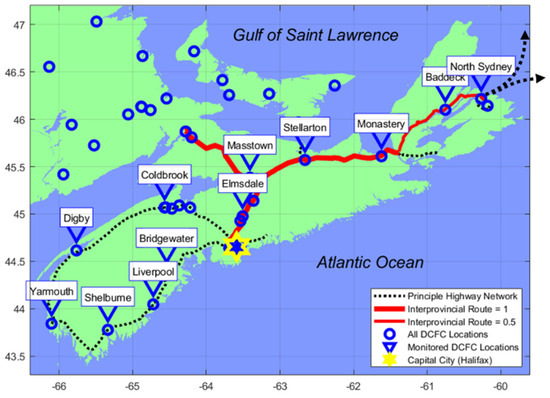 Due to the importance of these two routes and possible differences in driving patterns associated with interprovincial travel, they were evaluated as an explanatory (independent) variable to the utilization of the 12 DCFC sites. Four of the sites, ‘Masstown’, ‘Stellarton’, ‘Monestary’, and ‘Elmsdale’, which are all located within 1.5 km of highway exists from these two highways, were attributed a score of 1. Two other sites, ‘Baddeck’ and ‘North Sydney’, were attributed a score of one half (0.5). ‘Baddeck’ is unambiguously located on the Trans Canada highway, but on a portion for which there is a competing highway of similar capacity (route 4), and where significant stretches of the highway cease to be controlled access (i.e., grade-level cross streets and driveways connect to the highway). ‘North Sydney’ is close to the Trans Canada and the ferry links to Newfoundland but is more directly accessed from the branching Highway 125 and is in another area where the Trans Canada ceases to be controlled access. The highways that conferred a score of 1 or 0.5 to the ‘Interprovincial Travel Route’ metric are illustrated in Figure 4.