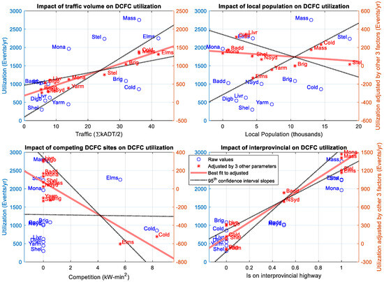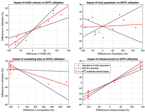 In Figure 6, four subplots show the values of each of traffic (top left), local population (top right), competing DCFC sites (bottom left), and being on an interprovincial travel route (bottom right, refer to Section 2.5), normalized by Equation (4) and adjusted by each of the three other explanatory variables. As in Figure 5, red stars indicate the values of the 12 individual sites, the best linear fit is indicated with a thick red line, and the 95th percent confidence interval of linear fit is shown by two black dotted lines.