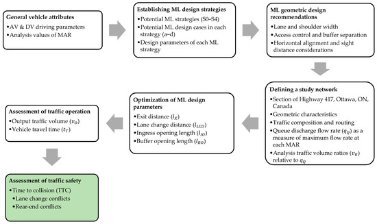 The principal management strategies used for MLs are categorized based on pricing, vehicle eligibility, and access control. Access to an ML can be restricted to specific locations on the freeway (restricted-access control) or may permit vehicles to enter at any location (continuous-access control) [7]. ML orientation is another essential consideration that requires the analysis of travel patterns and potential conflicts with ingress and egress ramps [8]. The most common practice is to position MLs at a freeway’s left side, alongside the median, to facilitate long-distance trips and fewer conflicts with traffic exiting and entering the freeway at ramps [9]. However, to consider the potential of servicing long- and short-distance trips, planning MLs to separate AVs and DVs should consider different strategies, utilizing left- and right-side ML orientations along with continuous and restricted access. Therefore, the objective of this paper is to assess the expected safety performance of MLs in a mixed AV-DV environment involving different strategies based on orientation, access control, and vehicle eligibility. These MLs will be referred to as AVMLs or DVMLs depending on whether the eligible vehicles are AVs or DVs, respectively. To cover the different stages of vehicle fleet transition from the current condition of an all-DV fleet (MAR = 0%) to a projected future condition of an all-AV fleet (MAR = 100%), the analysis was performed for three MARs, namely 25%, 50%, and 75%. The term AV in this paper refers to a vehicle where all driving tasks are executed by the automated driving systems while traveling on the freeway, which corresponds to automation level 3 (L3) in the Society of Automotive Engineers (SAEs) classification [10]. The results generated in this study can assist practitioners when deciding on whether to implement AVMLs/DVMLs as the MAR increases to manage vehicular traffic on the freeway.