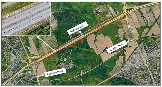 Different ML strategies were then identified based on orientation, vehicle eligibility, and access control. These strategies are referred to as S1–S4, with different cases in each strategy, as explained in Section 3.1. Based on the AV characteristics, recommendations for the geometric design of the ML envelope for the different strategies were addressed in another study [34]. A study network was then identified on Highway 417, Ottawa, Ontario, as shown in Figure 2. Geometric and traffic characteristics of the study network were collected from different sources, as detailed in [3]. Because HVs made up only 5% of the traffic volume on the study network [3], all HVs were assumed to be driver-operated vehicles. Thus, the MAR was applied only to PCs that were then classified as AVs or DVs. The queue discharge flow rate () was estimated for this section at the different MARs as a measure of freeway capacity in heterogeneous traffic. The main design parameters of all proposed strategies and design options were then optimized following a process conducted using a traffic microsimulation, which was detailed in [35], as explained in Section 3.2. The optimized strategies could then be used for assessing traffic operation, as explained briefly also in Section 3.2, and safety performance, which is the focus of this paper.