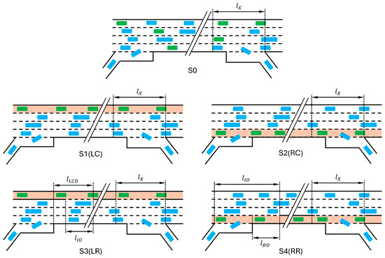 - Lane change distance (): The distance required for the eligible on-ramp vehicles to merge onto the ML, measured from the end of the acceleration SCL to the end of the restricted-access opening section. This parameter is relevant for S3(LR).