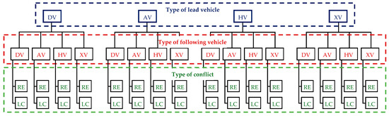 where = conflict rate of type , involving lead vehicle type and following vehicle type ; = number of conflicts of the same type and involving the same lead and following vehicle types; = vehicle volume of the following vehicle type; ∈ [RE, LC]; and and ∈ [DV, AV, HV, XV].