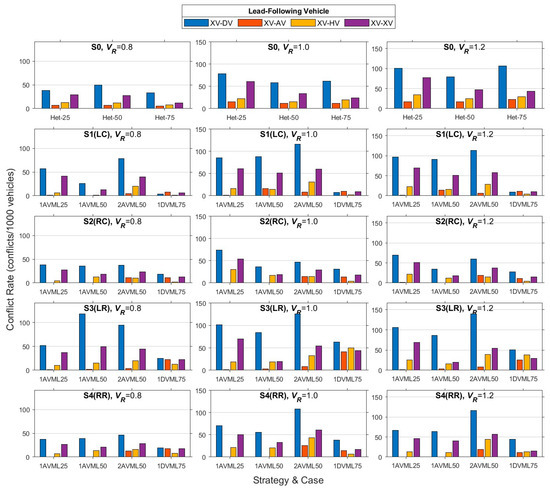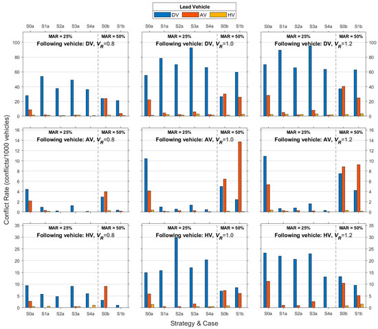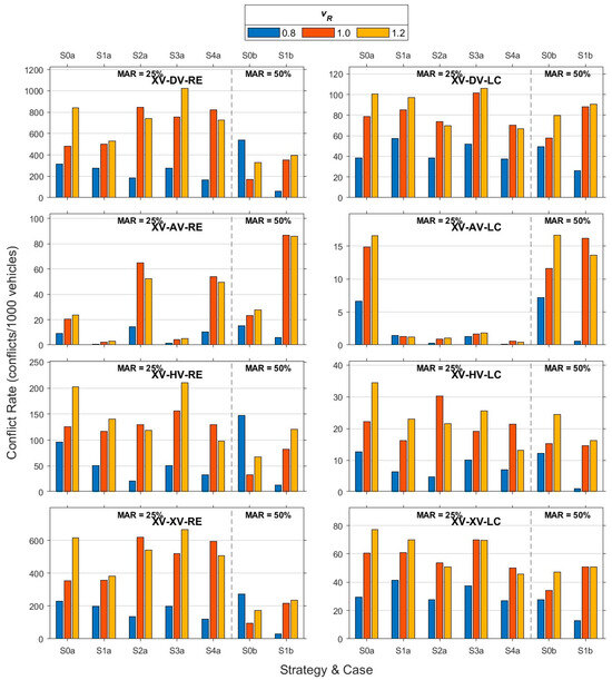 Figure 7, Figure 8 and Figure 9 confirm the trends previously observed when comparing all strategies. Specifically, XV-DV exhibits the highest aggregated rear-end and lane change conflict rates. These higher rates result mainly from high DV-DV conflict rates, which could be due to the higher TTC threshold value. The figures also show that, when the following vehicle is an AV, the highest rear-end conflict rates are AV-AV-RE. However, for the lane change conflicts, Case a(1AVML25) in all strategies has DV-AV-LC conflict rates higher than those for AV-AV-LC. This trend deviates from the general trend in Figure A5, where the AV-AV-LC conflict rates are generally higher than those for DV-AV-LC. The figures also show different trends in relation to the change in conflict rate with ML deployment relative to S0. First, at the low traffic demand level ( = 0.8), the aggregated XV-XV-RE conflict rates are lower for all five ML options than for the case of heterogenous traffic. As the traffic demand level approaches or exceeds capacity ( = 1.0 and 1.2), the aggregated rear-end conflict rates may increase for some options. Still, S1a(LC-1AVML25) experiences lower aggregated rear-end conflict rates of all types than S0. However, as shown in Table 2, the differences in the rear-end conflict rates are mostly insignificant for conflicts involving only DVs and HVs, while the differences are mostly significant for conflicts involving AVs as the lead or following vehicles. For the overall aggregation (XV-XV-RE), only 33% of all comparisons at 25% MAR returned statistically significant differences from the case of heterogeneous traffic. For the only ML option at a 50% MAR, which is S1b(LC-1AVML50), the rear-end conflict rates are generally lower than those for heterogenous traffic at the low traffic demand level ( = 0.8) but mostly higher at the higher demand levels ( = 1.0 and 1.2). As shown in Table 2, most of these differences are statistically significant. This result could be due to the increase in traffic turbulence generated by the number of AVs on the freeway as they seek an opportunity to enter the left-side ML at higher demand levels.