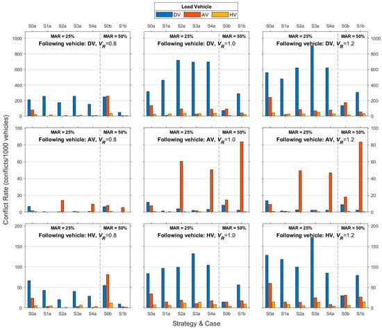 First, Figure 5 summarizes the rates of aggregated rear-end conflicts for each following vehicle type, while Figure A1, Figure A2 and Figure A3 in Appendix A summarize the individual vehicle rear-end conflict rates for each combination of lead and following vehicle types. For the easy comparison of all strategies and design options, the y-axis in these figures is scaled based on the maximum rate in each column of subplots in each figure. As mentioned previously, the conflict rates presented in these figures use different TTC threshold () values based on the type of following vehicle. First, Figure 5 shows that the aggregated conflict rates are fairly low for S0, with a trend of slight increase as increases. The highest aggregated conflict rates are XV-DV-RE (the following vehicle is a DV) even at the high MAR of 75%, where DVs make up only 25% of all PCs in the network. This can be attributed to the higher TTC threshold () for DVs ( = 1.5 s) compared to AVs ( = 0.75 s), causing all events with a TTC in the range of 0.75 to 1.5 s to be excluded from the conflict count when the following vehicle is an AV but included when the following vehicle is a DV. In addition, as the MAR increases, both the number of XV-DV-RE and the DV volume decrease, with a net result of relatively high conflict rates.