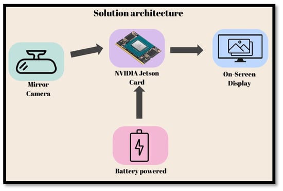 In Figure 2, we present the architecture of the solution, which has as its central part Nvidia Jetson TK1 hardware. We installed a common webcam, which was responsible for recording the movement of the car, complemented with the installation of a 12-inch touch screen, to allow the driver to independently interact with the device. To ensure that the solution could be used without the need for the electrical system of the car, we recommend the use of external power through an external power supply system using rechargeable batteries. The following figure details the architecture.