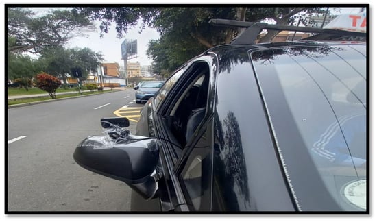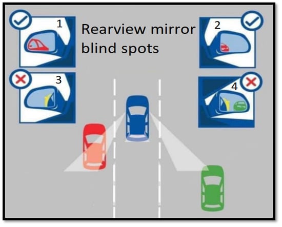 Figure 13 shows one of the main objectives of the solution presented, which is the blind spots presented by conventional side-view mirrors, which depends on the location of the mirror and the driver’s ability to use the image presented in the side-view mirrors.
