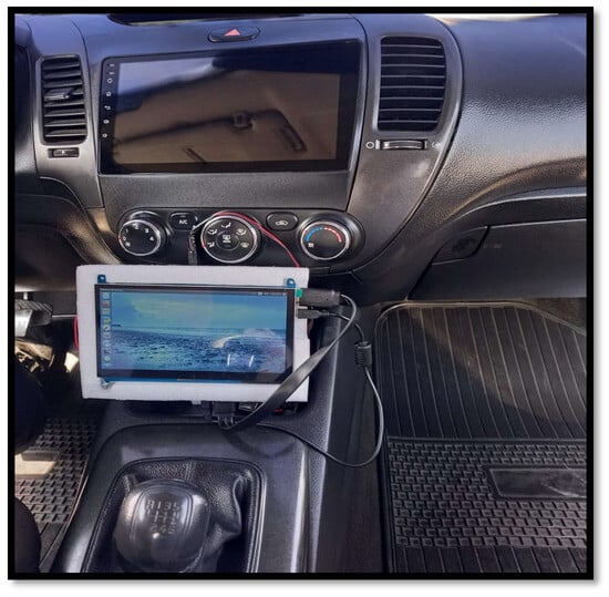 Figure 7 shows the installation of the solution inside the car for demonstration purposes. The solution was located on top of the gearshift lever so that the driver could view the image when the car was reversing. As can be seen, the card and the screen were integrated into a single component, which would allow its implementation in any type of car.