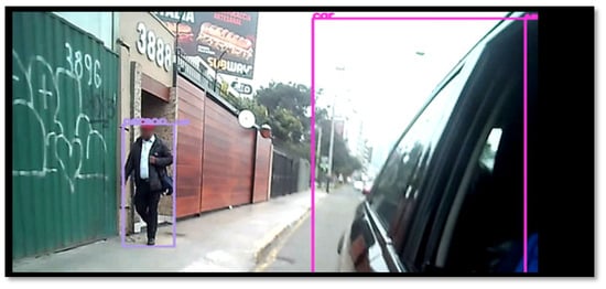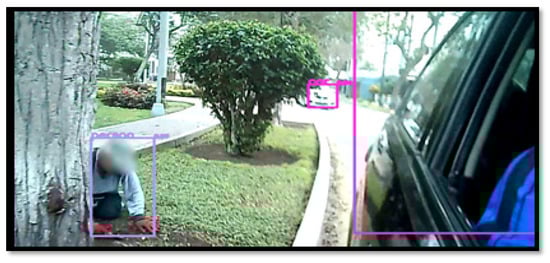 Figure 8 shows the detection of people and cars. In this very particular case, there is a person working in a garden, whose presence is hidden by a nearby tree. This tree may keep the driver from seeing the person. If the car is required to move back, our solution is very important for this case, as it provides help because detection is performed in real time; meters further back, the solution also allows the detection of a car, even if the image is not very sharp, so the architecture is robust for these two classes.
