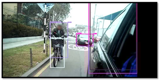Another of the most common accidents caused by collisions is when a car needs to back up and the driver cannot see nearby cyclists. With the proposal presented, it is possible to detect people who are in the coverage area of the camera, even when they are riding a bicycle, which demonstrates the high level of performance of the model presented; meters behind, a car is detected even though it is far away.