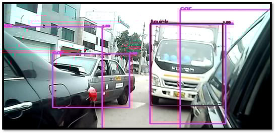 There are solutions based on convolutional networks for traffic detection in strategic areas of highways, where cameras are located along the center line of the road to detect cars and interact with traffic light systems to improve traffic flow []. In these cases, we use video classification of cars with live video recording from strategic locations. In the case of placing cameras in the car itself, we found systems that analyze the front view that the car faces when moving, which are trained to improve solutions that seek to provide autonomy to cars. In this particular case, YOLO architecture version 4 was trained with the MS COCO database [].