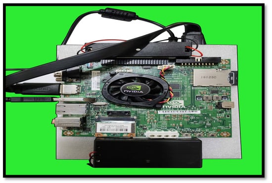 Figure 3 shows the hardware required to work with Jetson Tegra TK1. As can be seen, it has a reduced size of 5” × 5” (127 mm × 127 mm), which can be installed anywhere in the car. Tt has all the necessary components to work, requiring just a screen, keyboard and mouse to be connected.