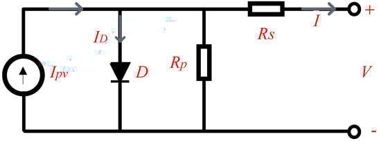 This section explains how to size the PV array battery and inverter and the maximum power point tracking (MPPT) in addition to selecting the suitable voltage control. To estimate the electrical parameters for a particular PV module, the IV and PV characteristics, short-circuit current, and open-circuit current at different operating conditions, such as solar radiation and module temperature, should be defined. A PV array comprises solar panels that have numerous series–parallel solar cells, DC-DC voltage converters (in some cases, DC-AC voltage inverters), controllers, and batteries. Figure 2 demonstrates the equivalent circuit of a solar panel.