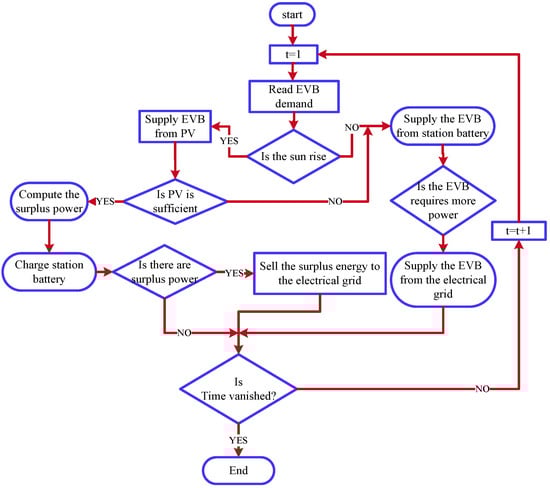 The focus of the charging control system in this research is to power an EVB using either a PV–battery system or the electrical grid. The control loop illustrated in Figure 3 facilitates selling excess energy to the grid to generate profit.