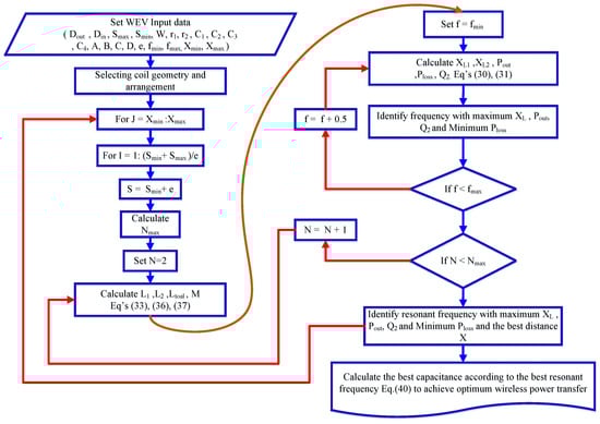 In EVs and based on Equations (36), (37) and (40), the resonant frequency depends on L C and M values, which change by varying the distance between the TC installed in the ground and the RC installed in the bottom of the EV. The height of the EV to ground is known to be approximately between 14 and 16 cm. The detailed design procedure to calculate the optimum WPT for EVB is shown in Figure 7.