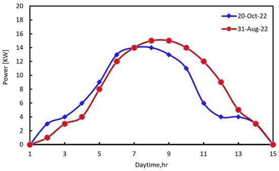 The system was initially configured with a 50 kW load, and for this specific design, a crystalline PV module from the CHSM6612p series, Astronergy Co., Edmonton, AB, Canada was chosen. By utilizing mathematical expressions from Equations (7)–(10) and assuming V, it was calculated that a total of 56 cells were needed. These cells were configured in seven units in series and eight units in parallel. For the specific battery chosen (DC260-12 8D 12V 260Ah AGM sealed lead acid battery, Full River Group Co., Camarillo, CA, USA) with a discharge coefficient () of 0.75, and in line with Equations (12)–(16) and (20), batteries were connected in series. The designated charge controller (Xantrex C60 charge controller 60A 12/24V C60, XANTREX, Elkhart, IN, USA) was selected. Following Equations (17) and (18) and with a safety factor (F) of 1.25, four controllers were linked in parallel for operation. Figure 16 provides a visual representation of the PV energy produced.