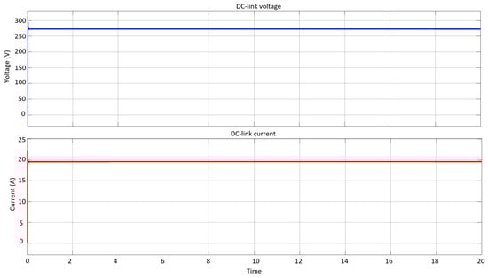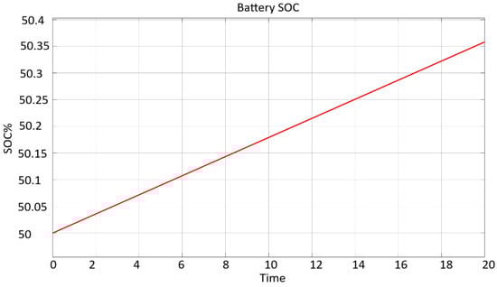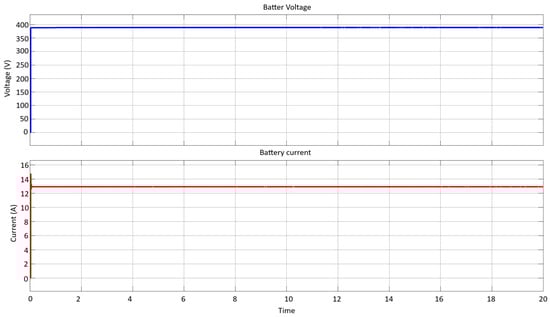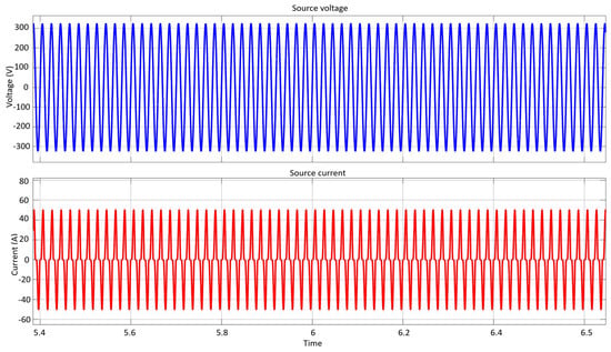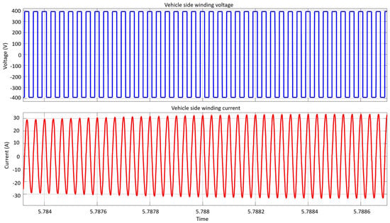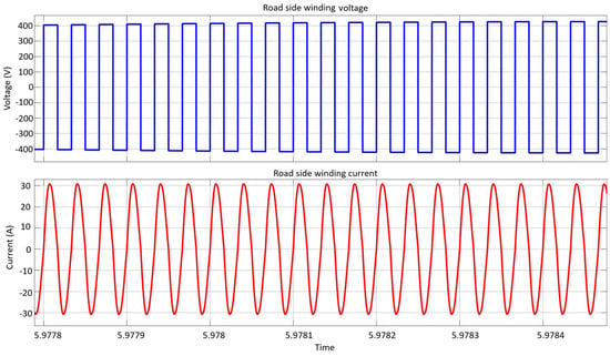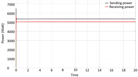 The operation of the proposed system was tested by applying two cases. In the first case, one car was charged while running at different speeds: 45, 60, and 75 km/h. The second case involved two cars that were charged simultaneously while running at the same speed, 45 km/h. The behavior of the system parameters was determined in terms of the sending and receiving power battery voltage; current DC link voltage; current roadside winding voltage; current vehicle side winding voltage and current; consumed active and reactive power source voltage and current; and finally, car battery state of charging. The station performance results are presented in Figure 17, Figure 18, Figure 19, Figure 20, Figure 21, Figure 22, Figure 23 and Figure 24 for a car speed of 45 km/h. Finally, the station analysis results for a single car with speeds of 60 and 75 km/h in addition to two cars are provided in Table 3.