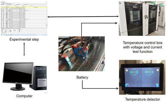 The charge and discharge equipment used in the experiment includes a temperature control box with voltage and current testing function, a temperature detector, etc., which mainly conducts high-/low-temperature charge/discharge testing, as well as monitoring of the voltage, current, and temperature of the experimental samples, as shown in Figure 1. By connecting the positive and negative electrodes of the experimental battery with the current collection wires and voltage collection wires of the temperature control box, T-type thermocouples are arranged in the test position of the battery. The initial temperature of the temperature detector is set to 25 degrees Celsius, and the experiment steps are set on a computer. Five T-type thermocouples are respectively arranged on the positive electrode, negative electrode, front side, bottom side, and flank of the test battery.