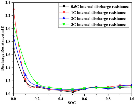 The relationship between the internal resistance of the experimental battery and the state of charge was obtained by fitting the internal resistance, as shown in Figure 3.