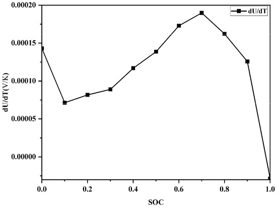 Figure 4 shows the relationship between the temperature entropy coefficient and the state of charge. According to the image, the temperature entropy coefficient ranges from −0.5 to 0.2 mV/K. When SOC is between 0.1 and 0.7, the temperature entropy coefficient shows an upward trend; when SOC is between 0.7 and 1, the temperature entropy coefficient shows an overall downward trend.