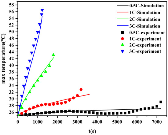 The simulation calculation of the maximum surface temperature of a single battery at four discharge rates of 0.5C, 1C, 2C, and 3C is compared with the temperature rise experiment. The results are shown in Figure 5. The simulation temperature rise results of the battery are basically consistent with those obtained in the temperature rise experiment. The maximum surface temperature is 29.1 °C, 32.8 °C, 43.1 °C, and 56.5 °C, respectively. Compared with the corresponding simulation results, the maximum temperature difference during discharge is 2.0 °C, 1.4 °C, 0.8 °C, and 1.8 °C, respectively. The temperature difference is less than 2 °C, which fully indicates that the numerical simulation of the battery temperature field thermal model used in this paper can well reflect the actual heat generation of lithium-ion power batteries.