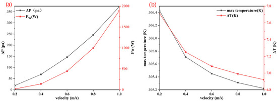 When the liquid flow rate is less than 0.6 m/s, the maximum temperature and maximum temperature difference on the battery surface rapidly drop, and when the flow rate continues to increase, the cooling effect gain caused by the flow rate decreases, and the pressure loss at the inlet and outlet increases by 126.88 Pa.