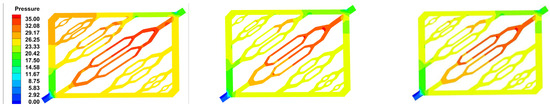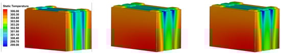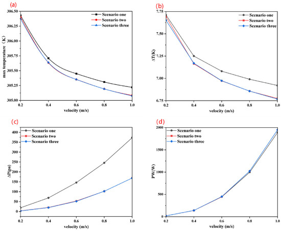 Under the same flow rate, the maximum surface temperature and maximum temperature difference of the battery module gradually decrease with the increase in the contact arc between the flow channels. However, after 0.4 m/s, there is basically no difference between the maximum surface temperature and maximum temperature difference of the battery module in Scenario two and Scenario three, while compared with Scenario one, the maximum surface temperature difference, maximum temperature difference, and pressure difference of the inlet and outlet significantly decrease. The pump power consumed by the three Scenarios at different flow rates is basically the same, which indicates that the increase in the contact arc radius between the flow channels will reduce the pressure loss in the flow channels and further improve the heat dissipation performance of the system. Figure 10 shows the pressure and temperature cloud diagram of the liquid cooling plate with biomimetic biological structure under the flow rate of 0.2 m/s of the three Scenarios. The pressure at the inlet is optimized and decreases as a whole, especially the pressure distribution in the uppermost flow channel. The pressure distribution in the flow channel of Scenario three is basically not much different from that of Scenario two, indicating that the increase in the contact arc radius no longer causes too much influence on the optimization of the system. In summary, it shows that increasing the contact arc of the flow channel is beneficial to reducing the pressure of the system.
