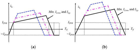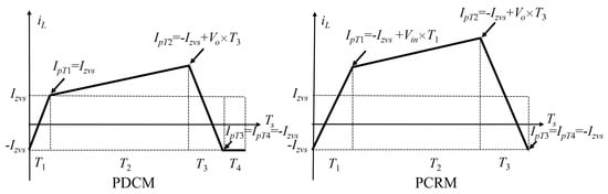 A relationship between Df1, the peak-to-peak value of the inductor current (ILp), and inductor current root mean square (ILrms) is established [14,15]. When Df1 satisfies the constraint of Equation (5), ILrms and ILp of the FSBB converter working in PCRM or PDCM are both minimized, as shown in Figure 2.