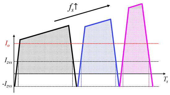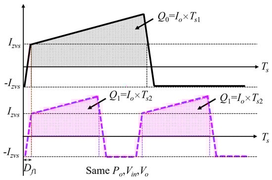 As shown in Figure 3, the inductor current waveform of the FSBB converter at different frequencies under the same output power, input voltage, and output voltage is shown. The shaded area in Figure 3 is the charge Q transferred from the input end to the output end in one cycle, which satisfied Equation (6), and Q0 = 2Q1, Ts1 = 2Ts2.