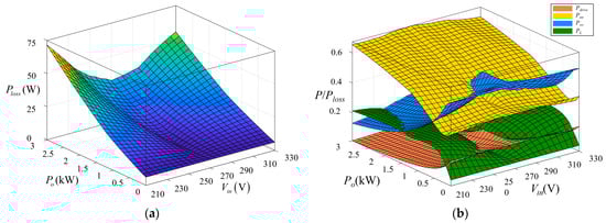 Loss and distribution of FSBB converter under different operating conditions with L = 7.0 μH and fs = 200 kHz. (a) Loss. (b) distribution.