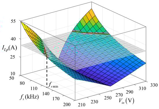 As the switching frequency decreases, the inductor current peak value will increase, resulting in an increase in di/dt when the MOSFET is turned off, thereby aggravating the crosstalk between the bridge arms and interfering with the stable operation of the FSBB converter. Therefore, the inductor current peak value should be less than the maximum peak current ILpmax allowed by the FSBB converter. When the FSBB converter operates at rated power and output voltage, by solving Equations (2)–(5), the variation of ILp with input voltage and switching frequency can be obtained, as shown in Figure 6. The cross-section is ILpmax, and when Vin = Vinmin, the switching frequency reaches the minimum value fsmin.