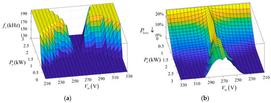 The switching frequency with the minimum Ploss under different input voltages and loads is shown in Figure 9a. Compared with the fixed-frequency PCCM-ZVS control strategy, the multi-frequency PCCM-ZVS control strategy based on the minimum Ploss proposed in this paper reduces the loss of the FSBB converter, as shown in Figure 9b. It can be seen that this control strategy not only improves the light-load efficiency but also significantly improves the efficiency when the input voltage is close to the output voltage.