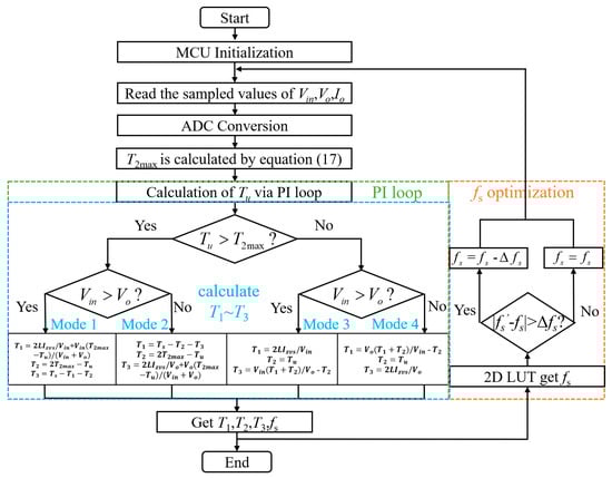The proposed multi-frequency PCCM-ZVS control strategy flow chart based on minimum Ploss is shown in Figure 11. In Figure 11, the input voltage, output voltage, and output current are obtained through the sampling circuit and converted into the MCU through the ADC. Then, the maximum value T2max of T2 at the current switching frequency is calculated and compared with the intermediate variable Tu calculated by the PI controller to determine whether the FSBB converter works in PDCM or PCRM, where T2max is shown in Equation (17). Finally, the current mode and equations are obtained based on the relationship between the input voltage and output voltage of the FSBB converter, and T1–T3 is calculated by the equations to modulate PWM.