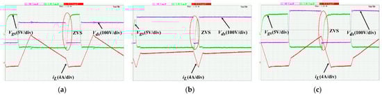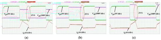 Waveform diagram achieving ZVS under different input voltages and 90% full-load. (a) Vin = 210 V. (b) Vin = 270 V. (c) Vin = 330 V.