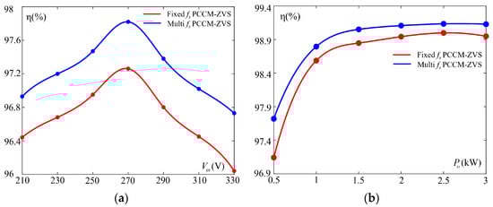 Figure 15 is a comparison of the FSBB converter efficiency under the fixed-frequency and multi-frequency PCCM-ZVS control strategies.