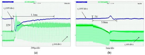 Figure 16 shows the dynamic waveforms of the FSBB converter when the load suddenly changes when the input and output voltages are rated. Figure 16a shows the changes in iL and vo when the load suddenly increases from 10% to 90%, the output voltage drops by 22 V, and the adjustment time is 1.1 ms. Figure 16b shows the changes in iL and vo when the load suddenly decreases from 90% to 10%, the output voltage rises by 7 V, and the adjustment time is 3.8 ms. The working conditions of Figure 16 show that the multi-frequency control method proposed in this paper has a fast dynamic adjustment speed and good stability.