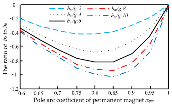 When the ratio of permanent magnet thickness to air gap length and the pole arc coefficient of the motor are constant, the relationship between the tooth pitch ratio, i.e., the ratio of b2 to b0, and the motor size parameters is shown in Figure 3. If the ratio of the thickness of the permanent magnet to the length of the air gap increases, the denominator in the formula decreases, and the values of b2 and b0 increase, gradually slowing down their growth trend. When the ratio of the thickness of the permanent magnet to the length of the air gap is different, the trend of the curve is the same, and there exists an optimal pole arc coefficient that maximizes the ratio of b2 and b0.