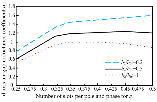 As can be seen from the previous text, the main inductance coefficient and second-order inductance coefficient are positively correlated with q. Additionally, due to the negative ratio of b2 and b0, when the number of slots is the same, the cross-axis air gap inductance coefficient also increases with the increase of q. The inductance coefficient of the direct axis air gap is the same. As shown in Figure 4, when q < 0.35, the direct axis air gap inductance coefficient αd is positively linearly correlated with the q value. When q > 0.35, motors with the same number of slots have similar direct axis air gap inductance coefficients.