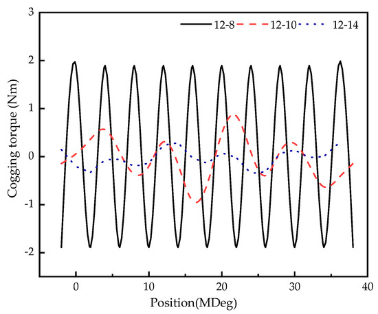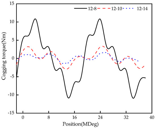 The previous section analyzed the output performance of the motor. In order to weaken the cogging torque of the motor and improve its performance, the industry standard practice is to use the stator skewed slots or the rotor skewed poles. The central idea is to divide the motor axially, with each piece differing by a specific angle, and weaken the specific harmonic amplitude in the voltage and torque by using a trigonometric function with the same waveform misalignment angle. Therefore, in this section, the rotor is divided into five sections using the rotor oblique pole scheme, with a total oblique pole angle of one slot pitch angle of 30°. Figure 9 shows the output of the motor cogging torque under different pole slot combinations. As shown in Figure 9, the peak torque of the motor tooth slot is 1.9 Nm at the 8-pole-12-slot, while it is 0.93 Nm and 0.28 Nm at the 10-pole-12-slot and 14-pole-12-slot, respectively. Compared to 10.8 Nm, 3.2 Nm, and 1.65 Nm without the skewed pole, it weakened by 82.4%, 71%, and 83%, respectively. The cogging torque of the motor is significantly reduced through oblique pole operation.