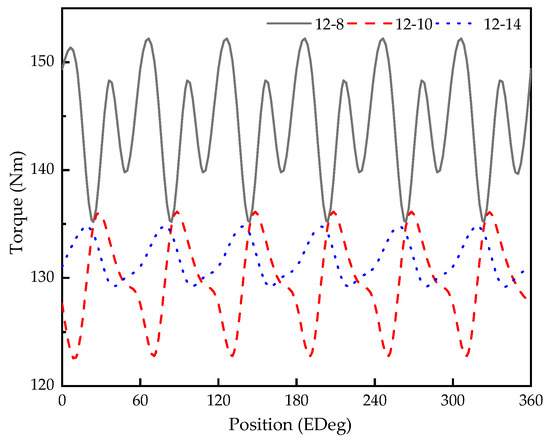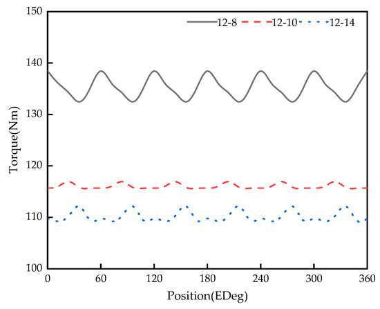 As shown in Figure 5, the peak torque of the motor slot is 10.8 Nm at the 8-pole-12-slot, while the peak values are 3.2 Nm and 1.65 Nm at the 10-pole-12-slot and 14-pole-12-slot, respectively. The reason for the significant difference in cogging torque is that the cogging torque of permanent magnet synchronous motors is generated by the magnetic common energy stored in the air gap, and its cycle number is the minimum common multiple of the motor stator and rotor. When the magnetic common energy is equivalent, the amplitude of cogging torque decreases with the increase of cycle number. The minimum common multiple of the stator and rotor of the three schemes mentioned above are 24, 60, and 84, respectively, and the peak value of the cogging torque shows an inverse ratio.