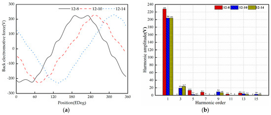 From Figure 7a, it can be seen that the maximum value of the no-load back electromotive force under the three pole slot coordination schemes of the motor is around 220 V, while the waveform of the back electromotive force in the 8-pole-12-slot scheme tends to be a flat top wave. This is because the motor pole distance is greater than the slot distance, resulting in a constant magnetic flux of the motor. The 10-pole-12-slot and 14-pole-12-slot schemes have a similar number of pole slots, and their back electromotive force waveform tends to be sinusoidal. However, considering the slotting of the motor stator, there are still 5th and 7th harmonics in the back electromotive force, respectively. The harmonic distribution of the phase no-load back EMF obtained by Fourier transform in Figure 7a is shown in Figure 7b. The harmonic distortion back EMF of the 8-pole-12-slot is 7.8%, the harmonic distortion back EMF of the 10-pole-12-slot is 10.6%, the harmonic distortion back EMF of the 12-pole-14-slot is 12.1%, the minimum harmonic distortion rate of back EMF is the 8-pole-12-slot.