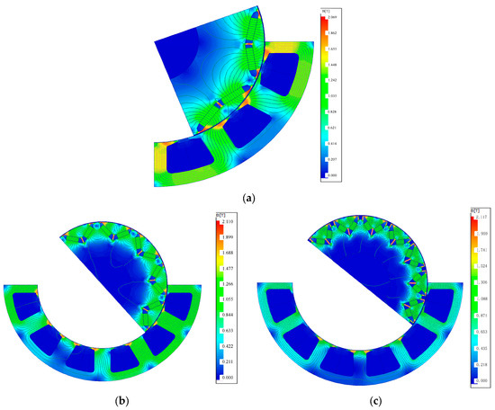 Distribution of motor magnetic field under different pole slot combinations: (a) 8-pole-12-slot magnetic density cloud diagram; (b) 10-pole-12-slot magnetic density cloud diagram; (c) 14-pole-12-slot magnetic density cloud diagram.
