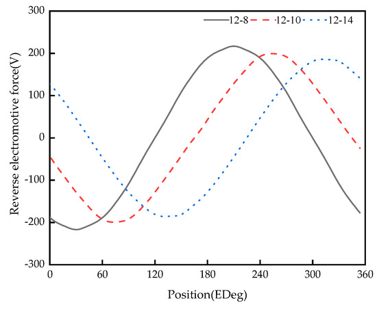 The output torque of the vehicle mounted permanent magnet synchronous motor should not only meet high torque density, but minimize torque ripple to avoid adverse experiences for passengers. The average output torque of the motor is 144 Nm, and the torque ripple is 10% at the 8-pole-12-slot, while the average output torque and torque ripple are 129 Nm, 9%, 131 Nm, and 3% at the 10-pole-12-slot, and 14-pole-12-slot, respectively. In the 8-pole case, the motor has the maximum output torque but also the maximum torque ripple, which needs to be improved through optimization methods. The output torque of the 10-pole is relatively low, and its torque ripple is also large. The output torque of the 14-pole can meet the power demand and its torque ripple is also low, so the torque performance of the 14-pole is better. The no-load back electromotive force of the motor under different pole slot combinations is shown in Figure 7.
